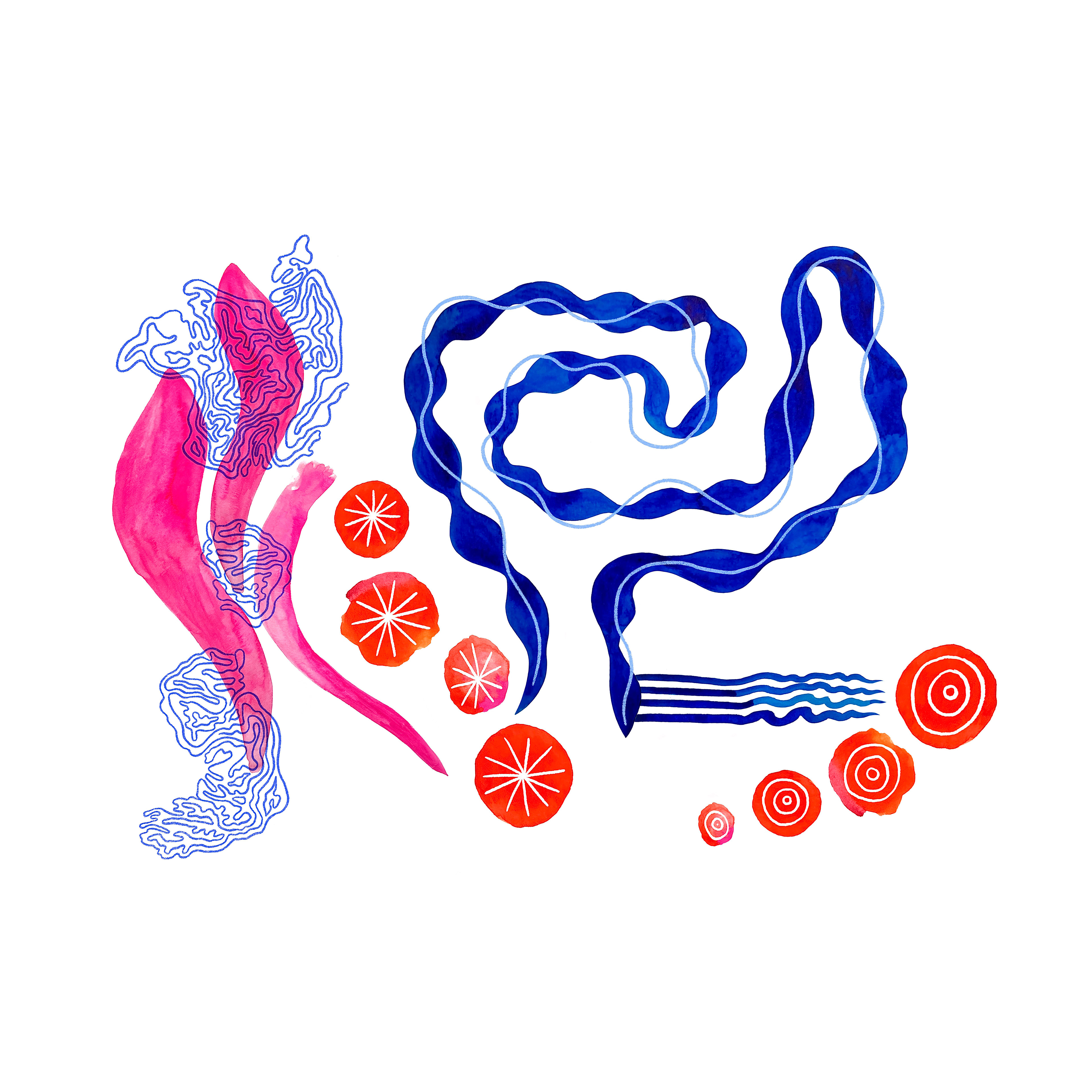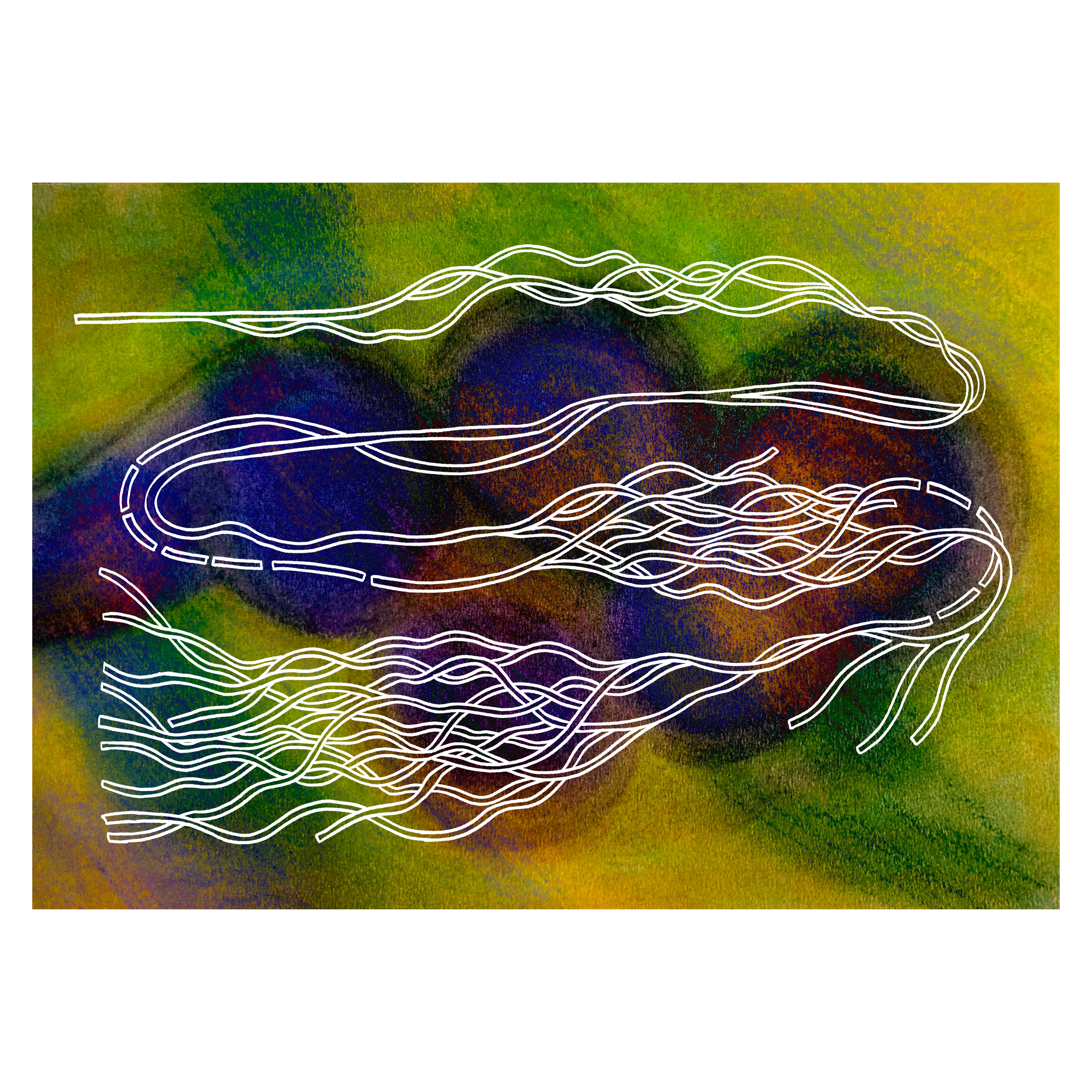 The somewhat soothing colours of the background contrast with the chaotic nature of the intertwining lines in the foreground, representing the beauty of chaos.